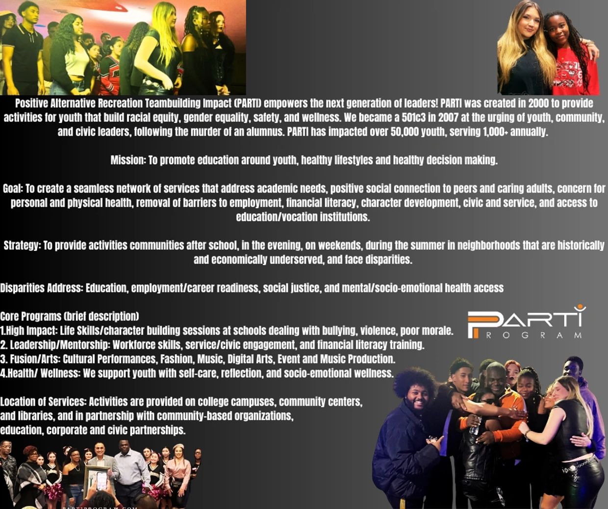 PARTI in partnership with local businesses, community groups, Chamber Of Commerce, education, and civic partners, build pathways for youth to develop skills to increase economic mobility and decrease the risk of unmet safety net needs which contributes to education disparities, and behavioral health risk factors, and unstable households.